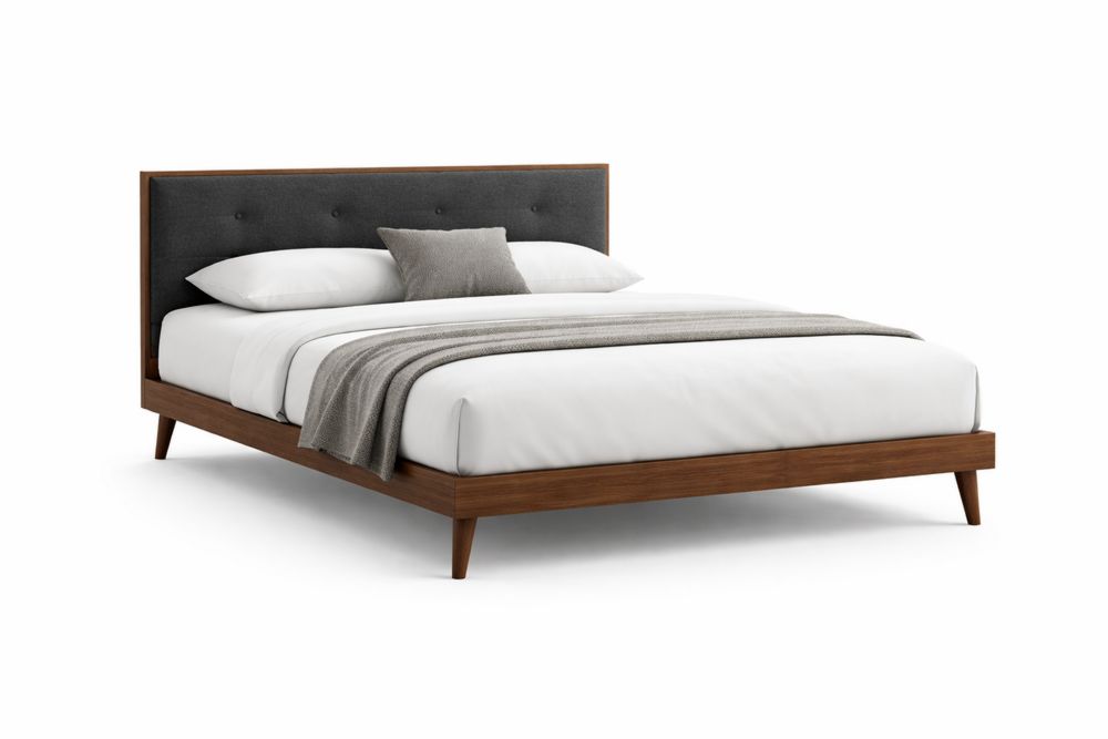 Lit double en bois de noyer avec tissu gris
