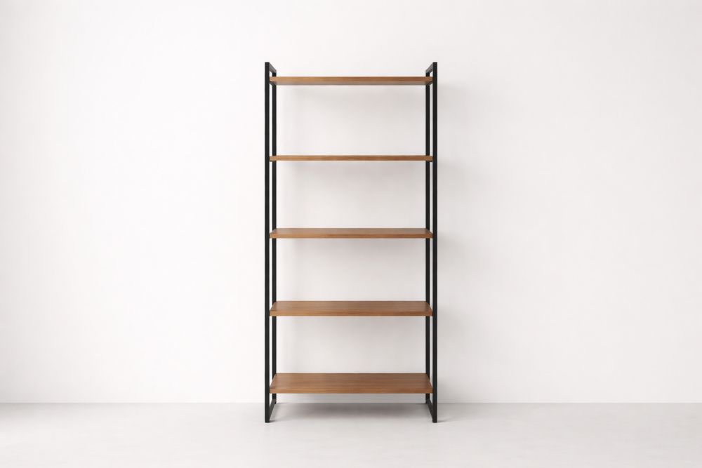 Structure en acier avec tablettes en bois finition noyer. Dimensions : hauteur 180 cm, largeur 80 cm, profondeur 30 cm. Couleur : structure noire, tablettes marron. Poids net : 20 kg.